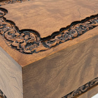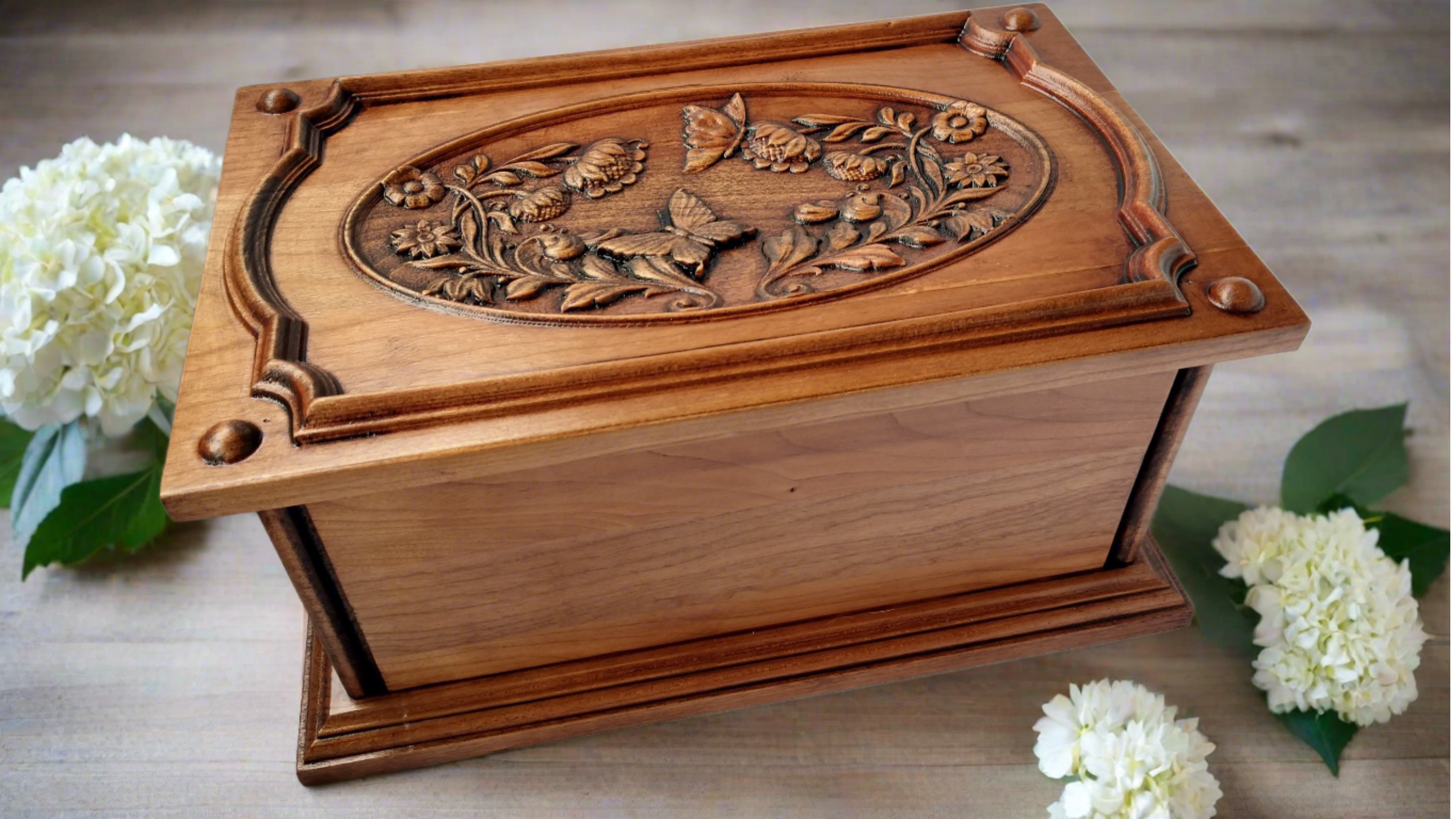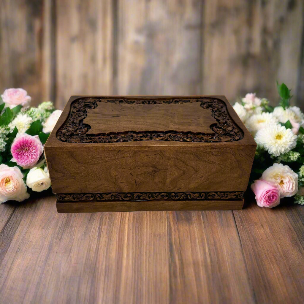 The top has carved images of butterflies and flowers surrounded by an ornate border • Beaded corners with molded edgesHuman ash urn for sale - elegant and dignified urn for storing cremated remains.